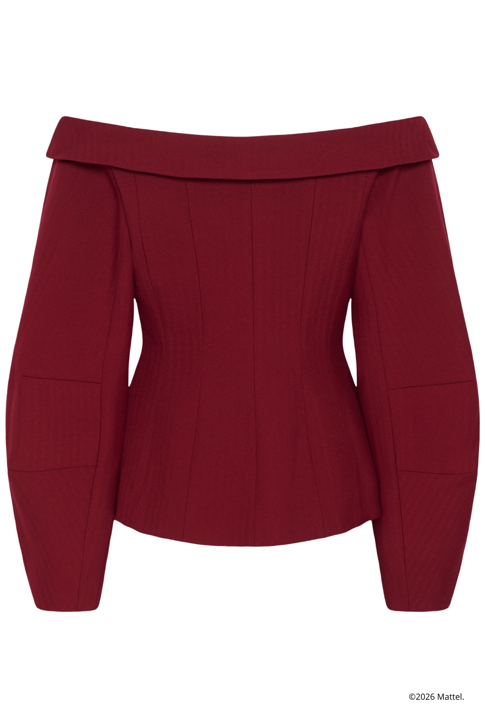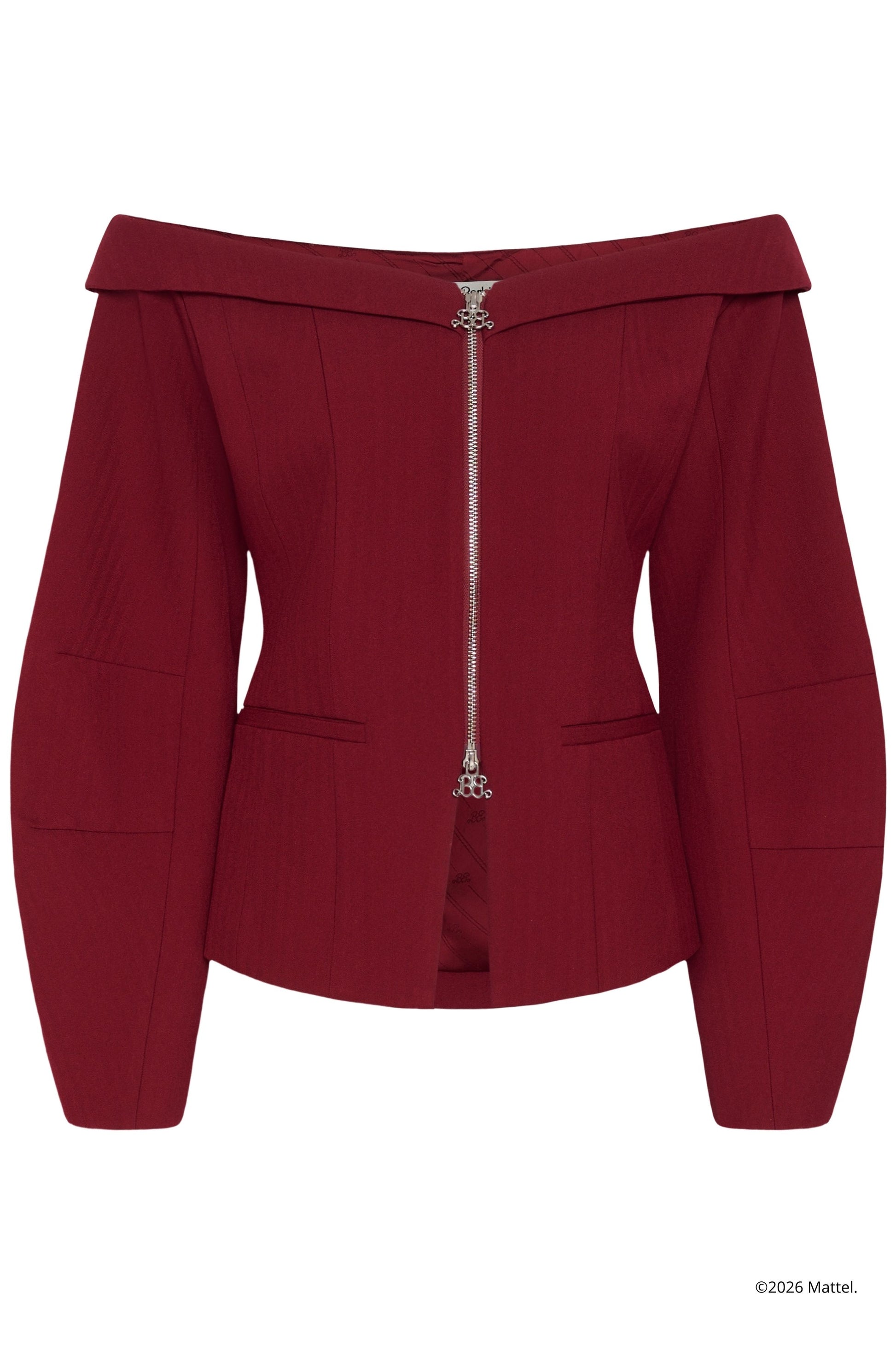 Off-shoulder blazer with wide sleeves and a fitted silhouette. The zipper features a Barbie logo charm in metal and a subtle tonal pinstripe pattern.