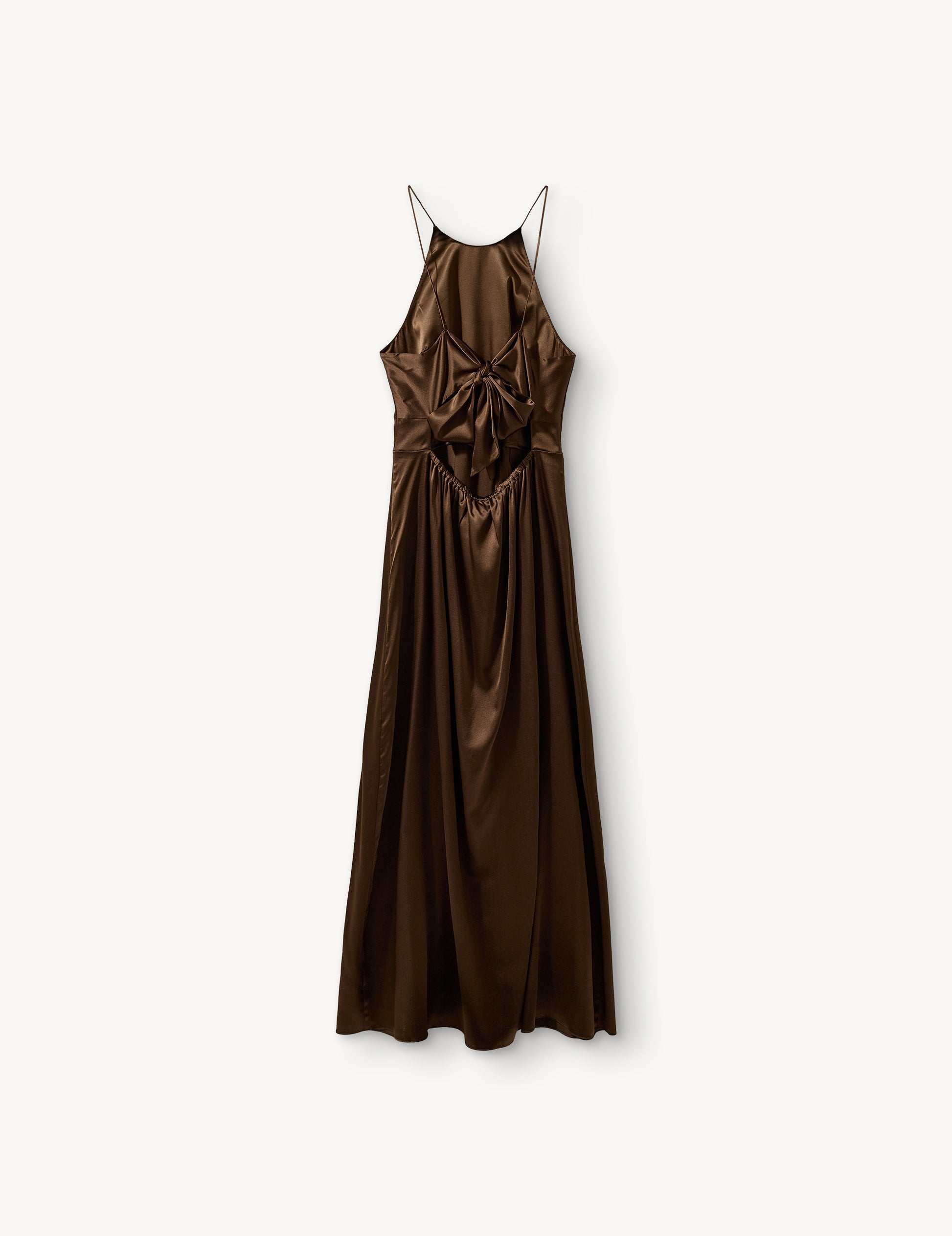 Fallegur silkikjóll með smá teygju í efninu og slaufu í bakið.