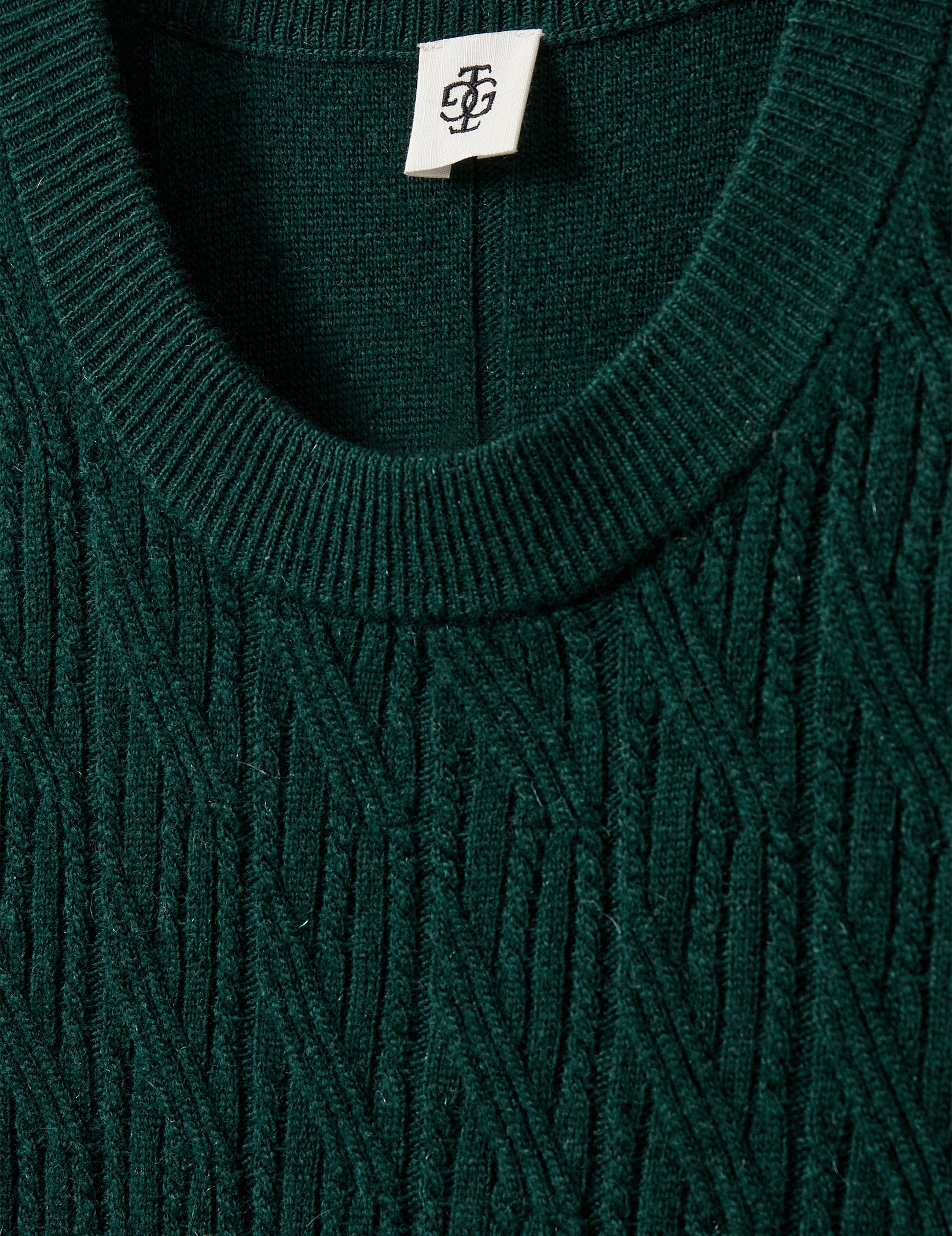 Einstaklega mjúkur og hlýr ullarbopur í djúpgrænum lit, með fallegu prjónamynstri úr ull og kasmír.
