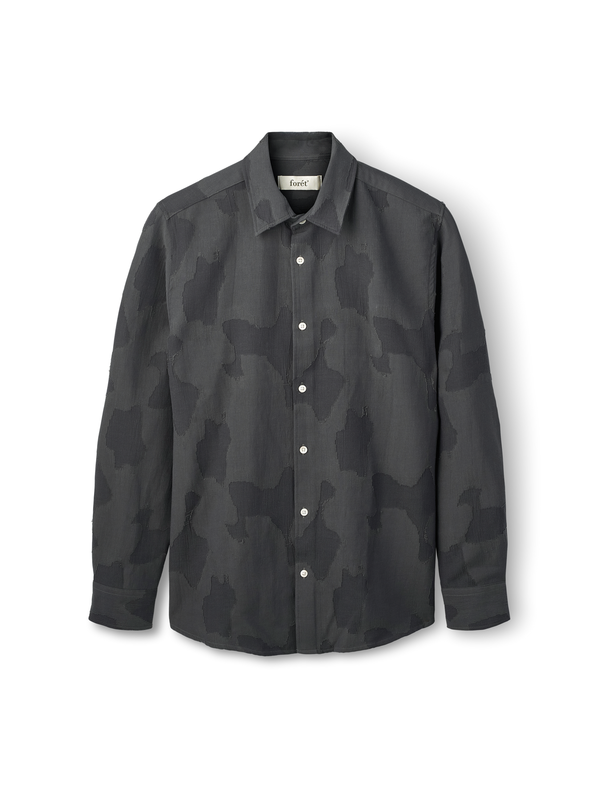 This dark grey shirt features a subtle jacquard camo pattern, offering a refined take on classic utility. With its clean lines and muted tones, it brings quiet character to everyday dressing.