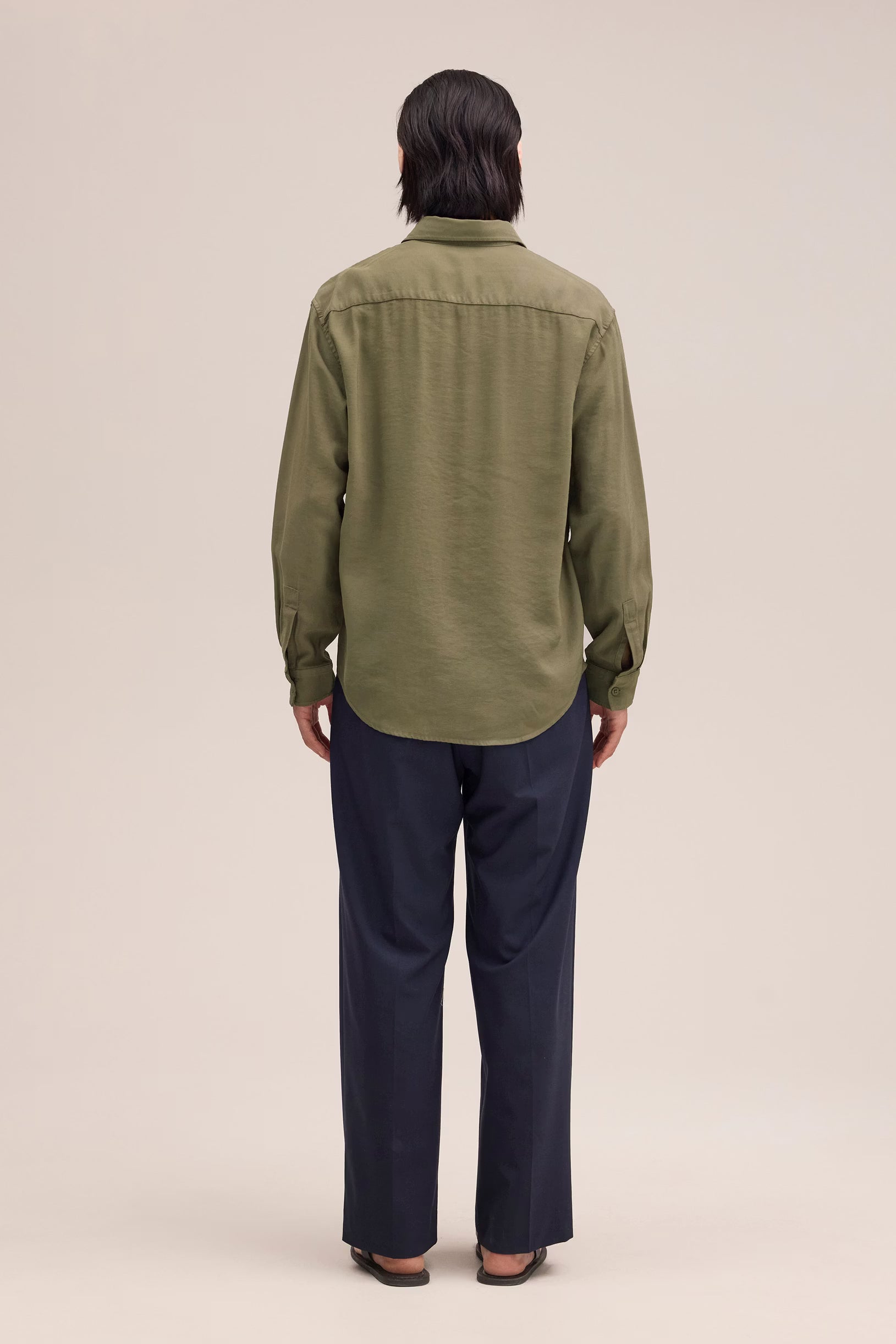 Medium-weight shirt made from soft, drapey LENZING™ ECOVERO™ viscose twill. Designed with a wide placket, curved hem, and slightly dropped shoulders.