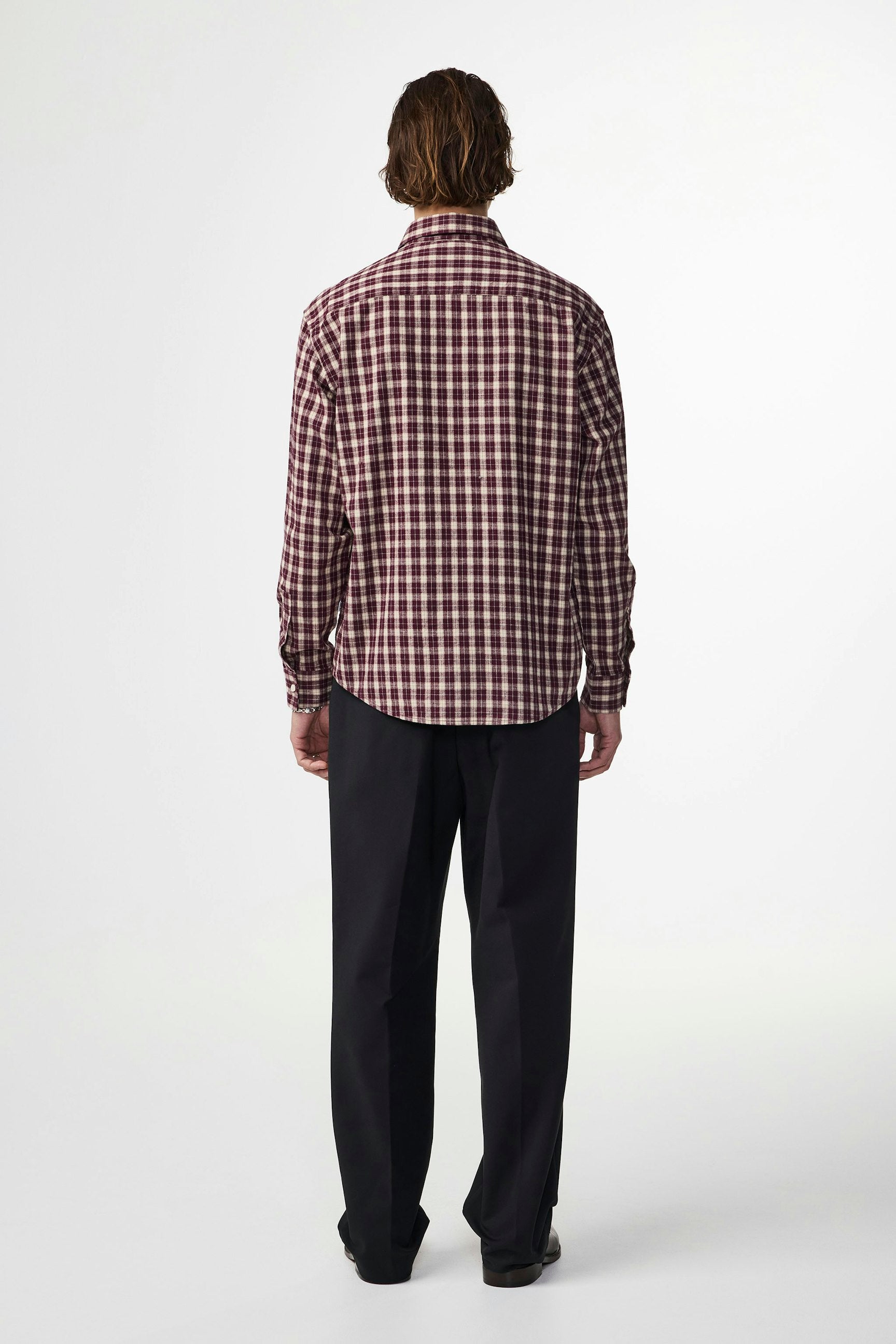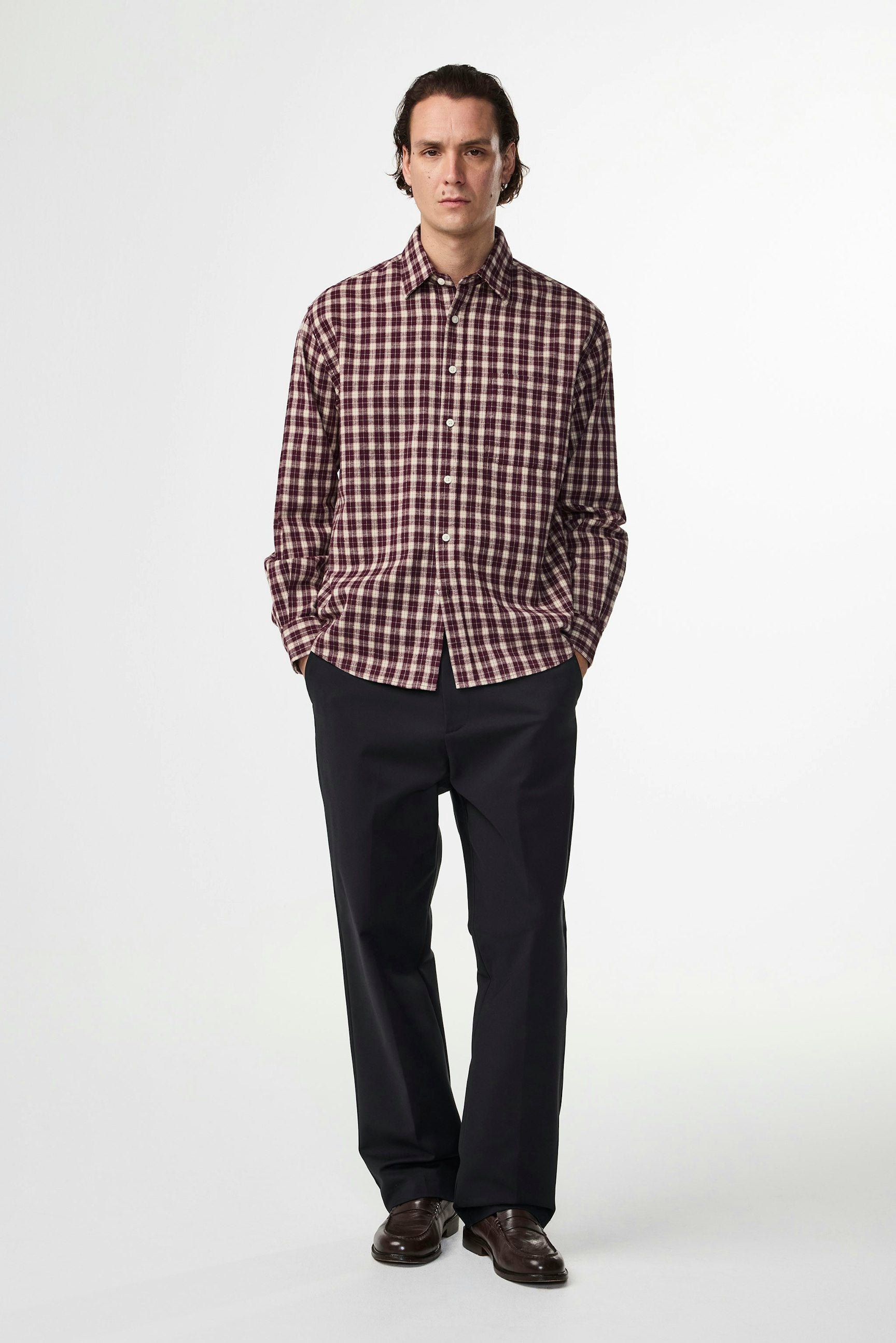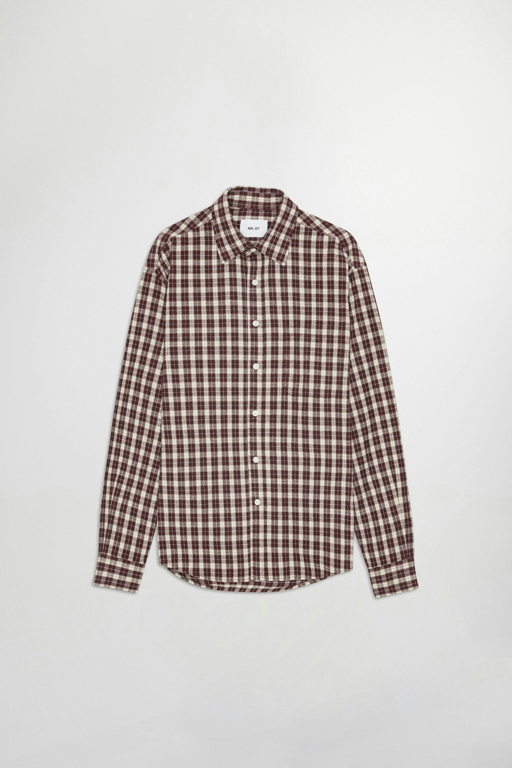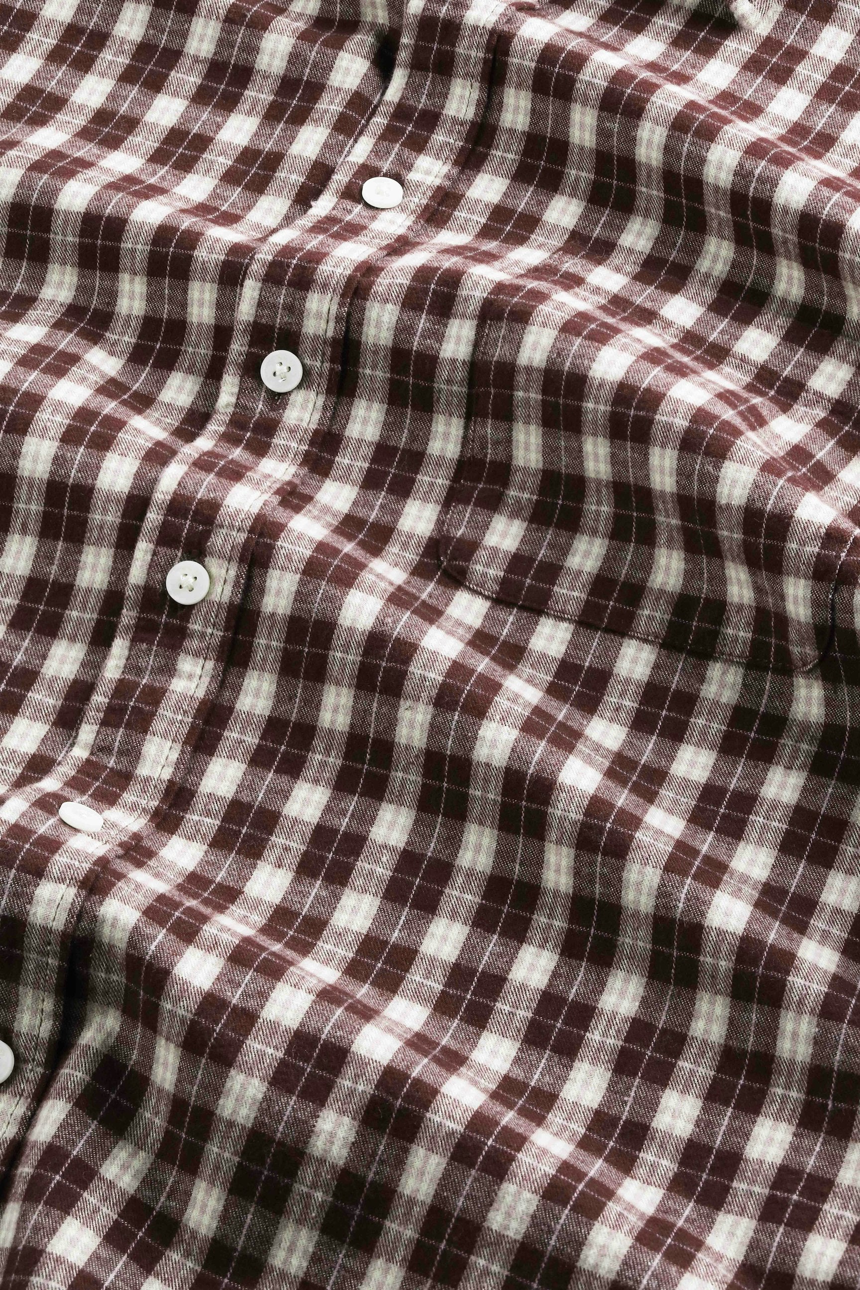 Button-up shirt made in soft cotton and woven in a flannel twill weave. Designed with a single patch pocket and rounded hemline.