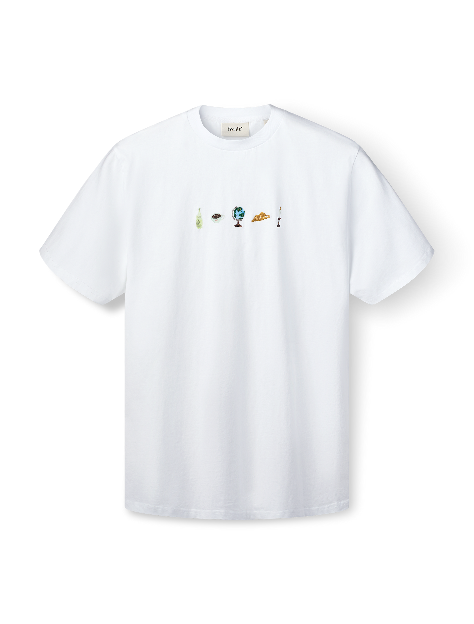 A reflection of the forét philosophy, this tee celebrates life’s quiet pleasures. Crafted from soft organic cotton, it features five delicate embroidered icons—a croissant, a bottle of wine, a coffee mug, a candlelight, and a globe—each a symbol of slow living and everyday joy.