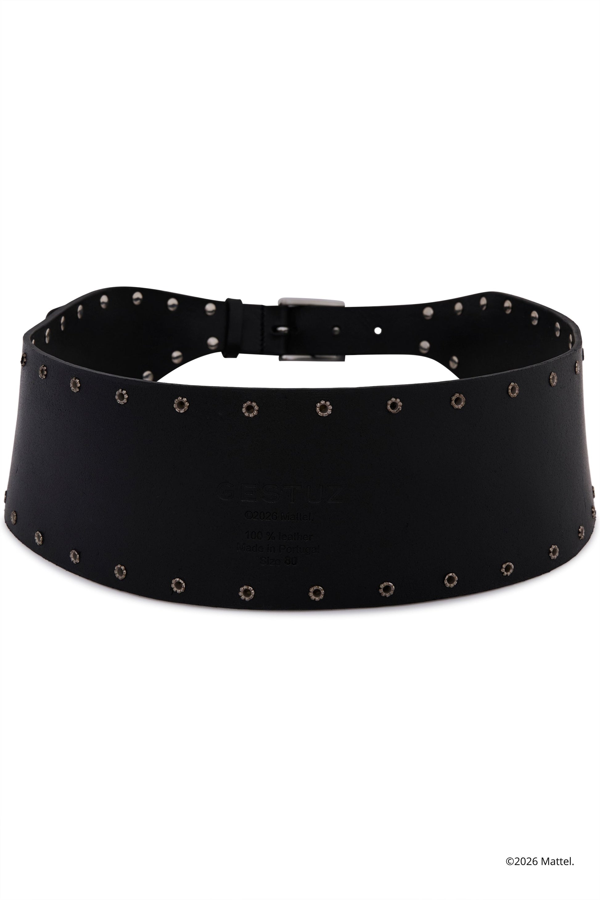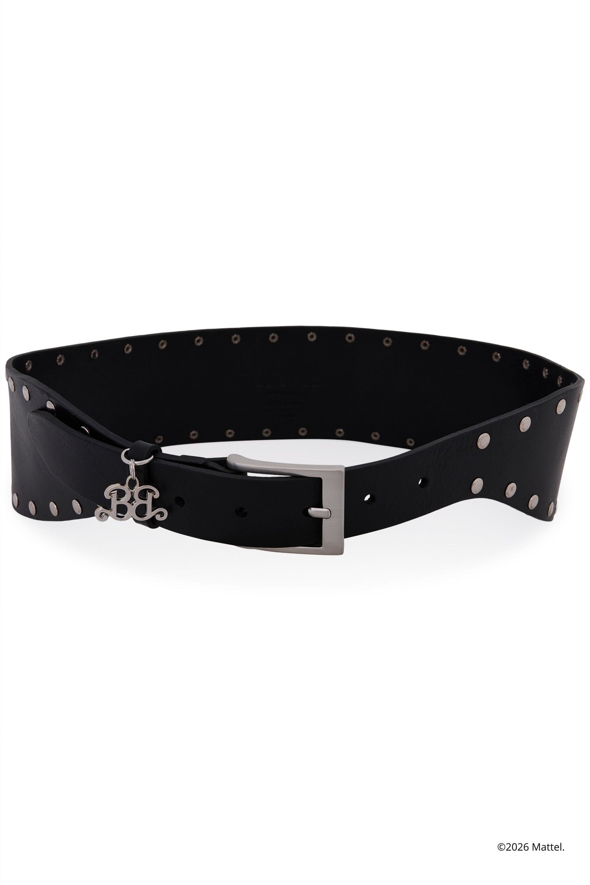 Belt in heavy leather with metal studs and a Barbie logo charm on the front.