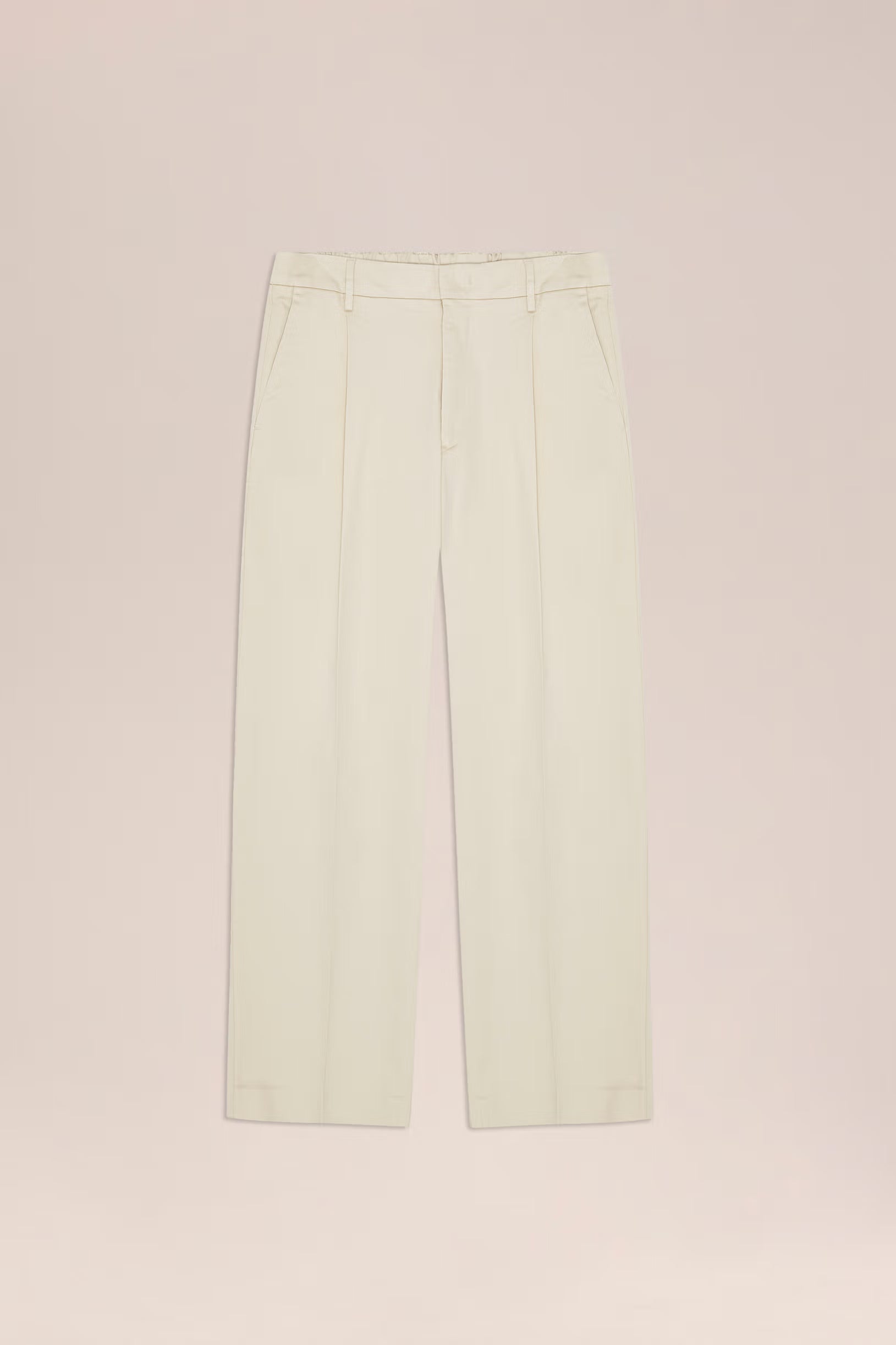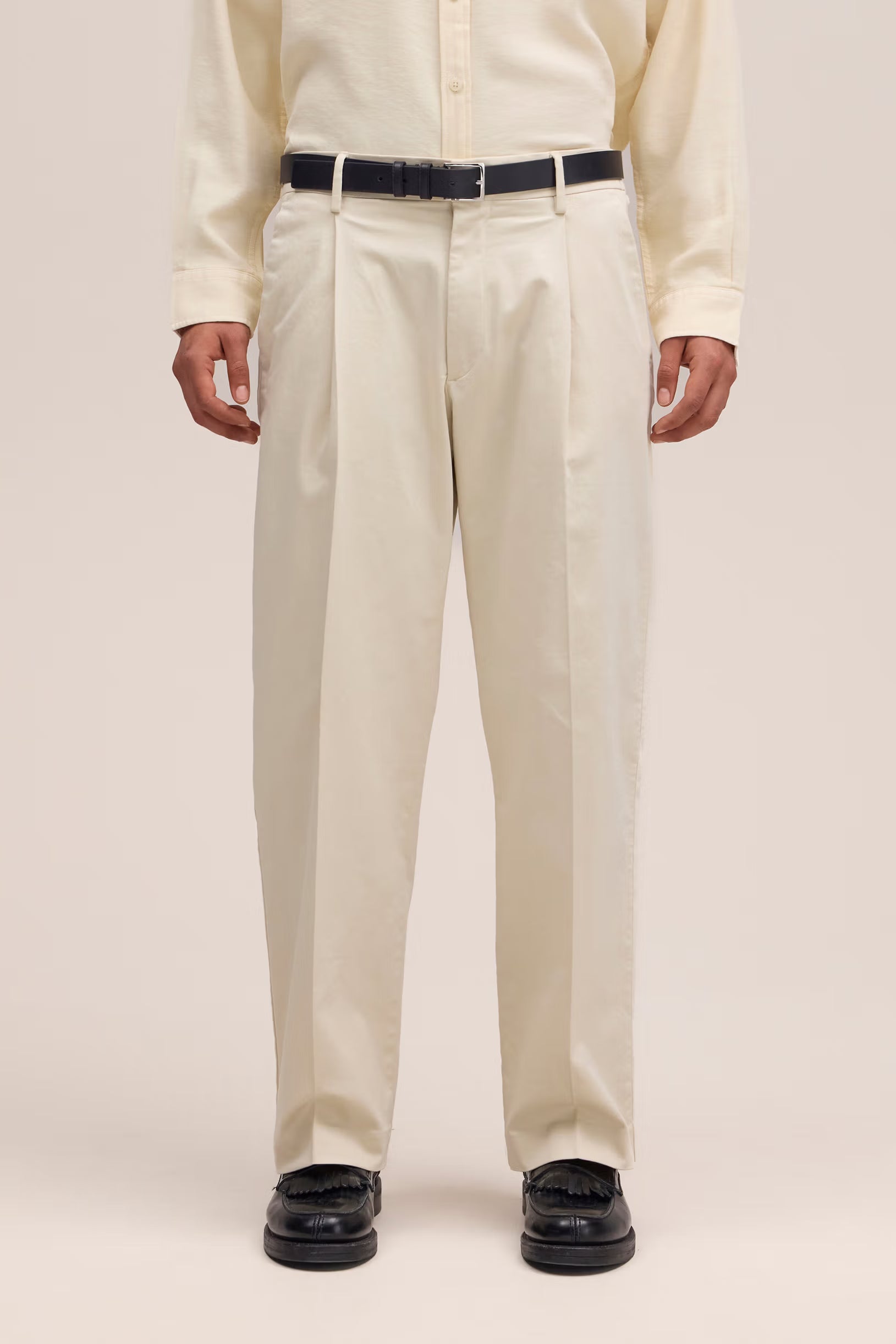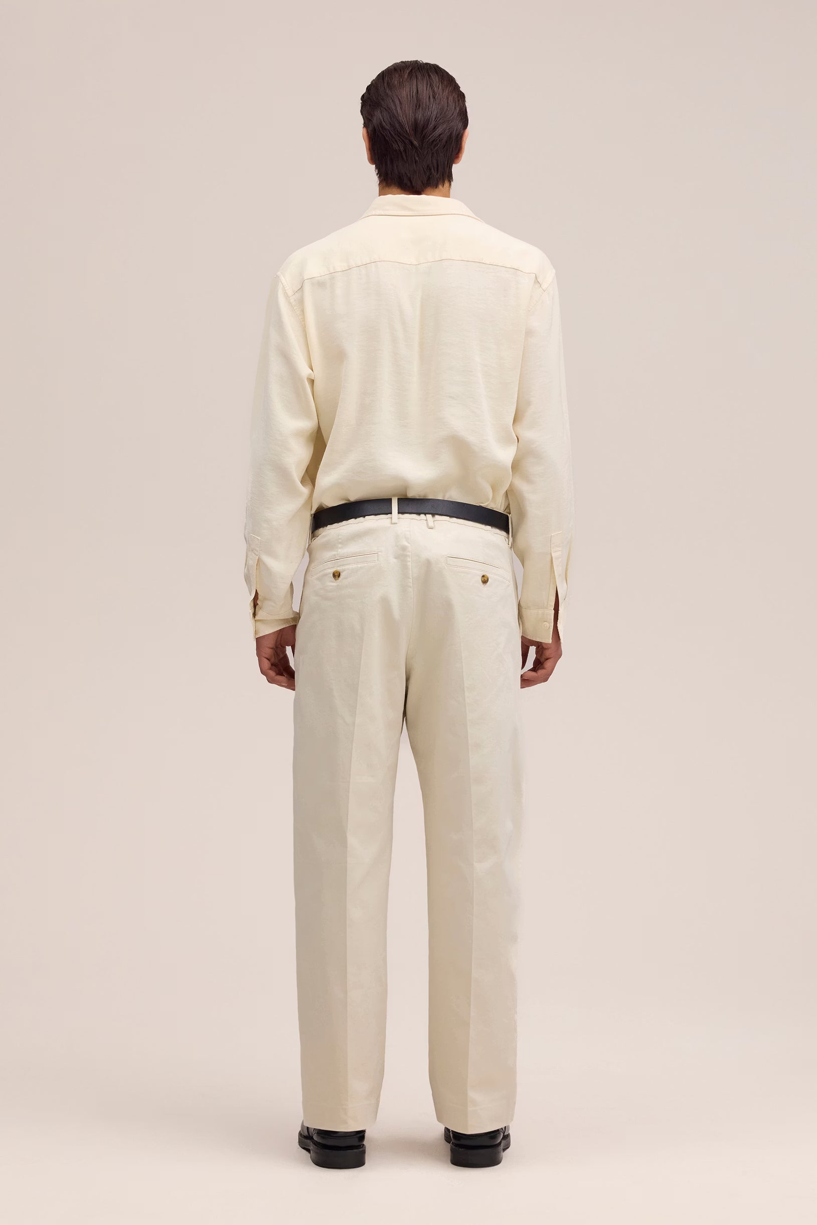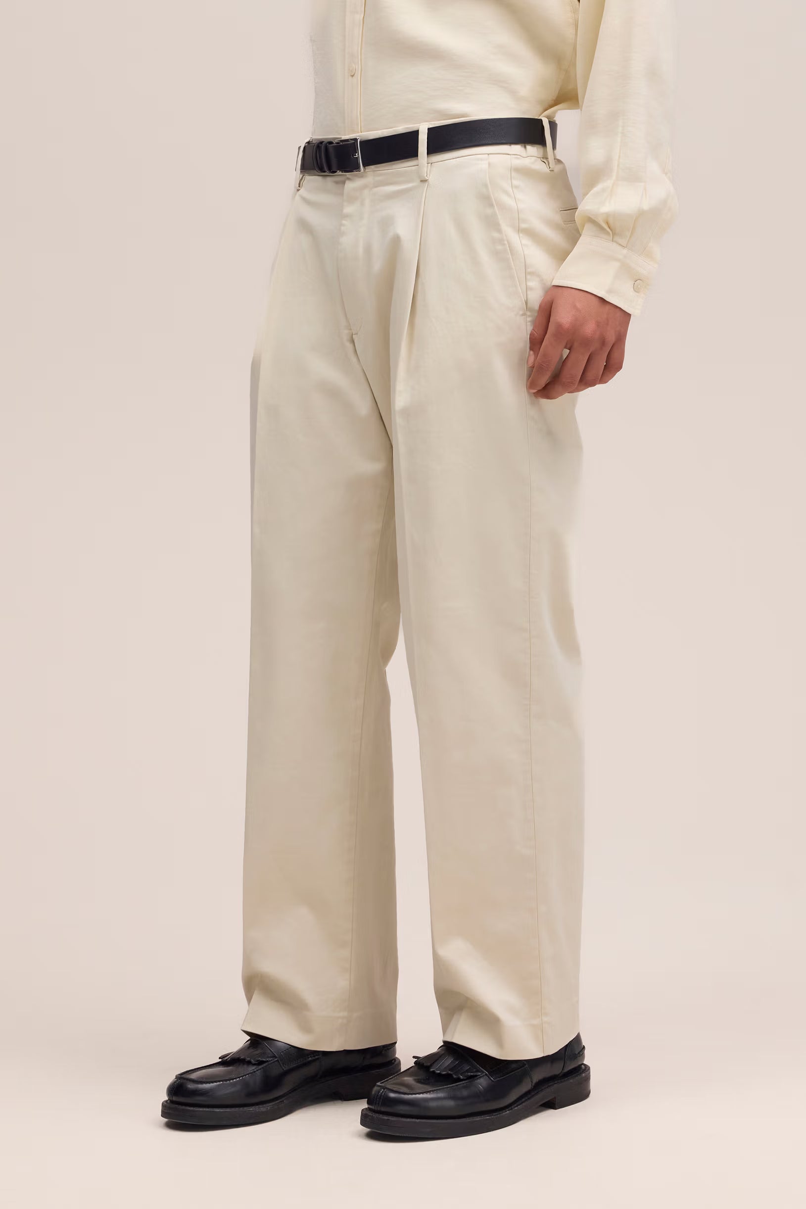 Relaxed-fit pleated trousers crafted from soft organic cotton with a lustrous satin finish. Designed with double pleats at the front and a hook and bar closure, offering a drapey yet crisp handfeel.