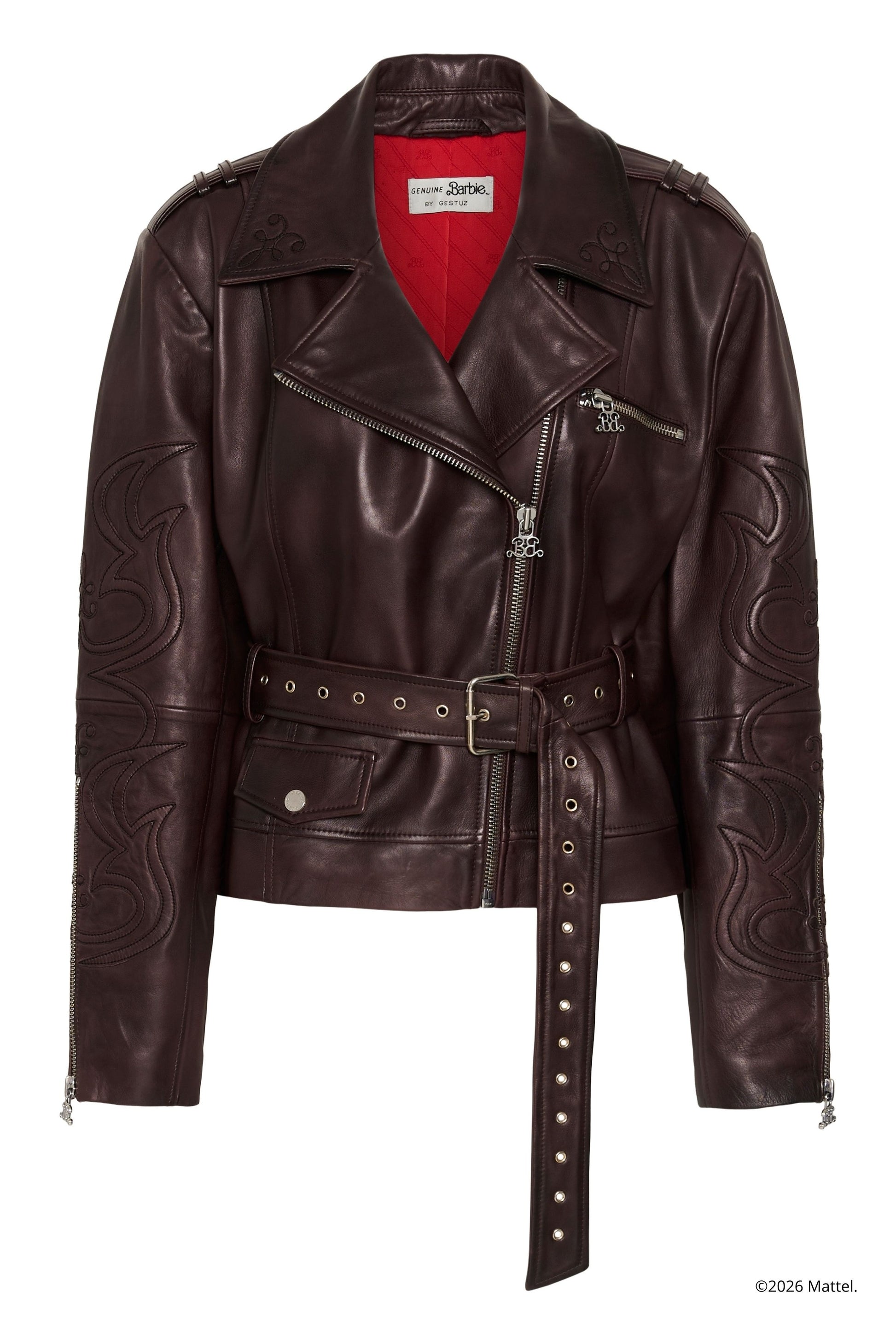 Leather jacket in soft leather with embroidered artwork on sleeves, collar and back. The jacket has a red lining with logo details and metal charms with Barbie logo on the zippers. The belt is removable.