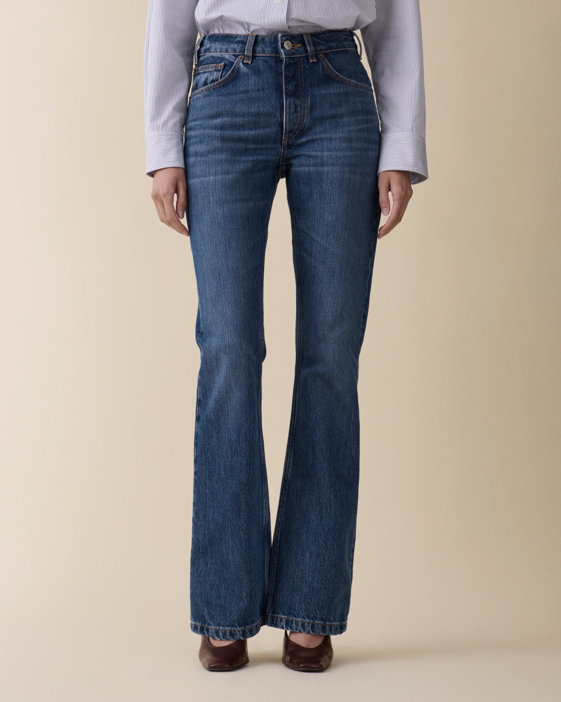 Mid waist, fitted top, straight flared leg, button fly, decorative button loop placement