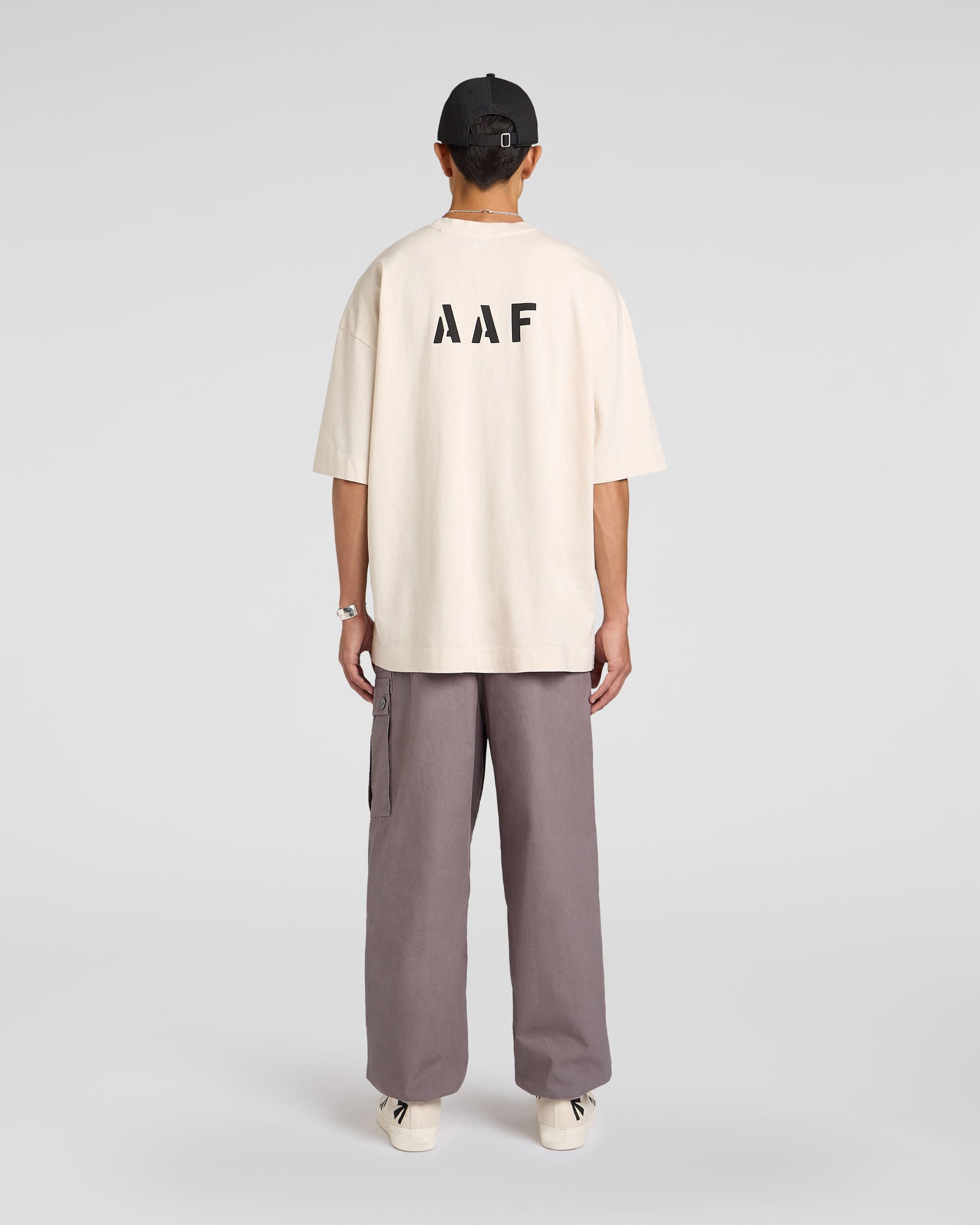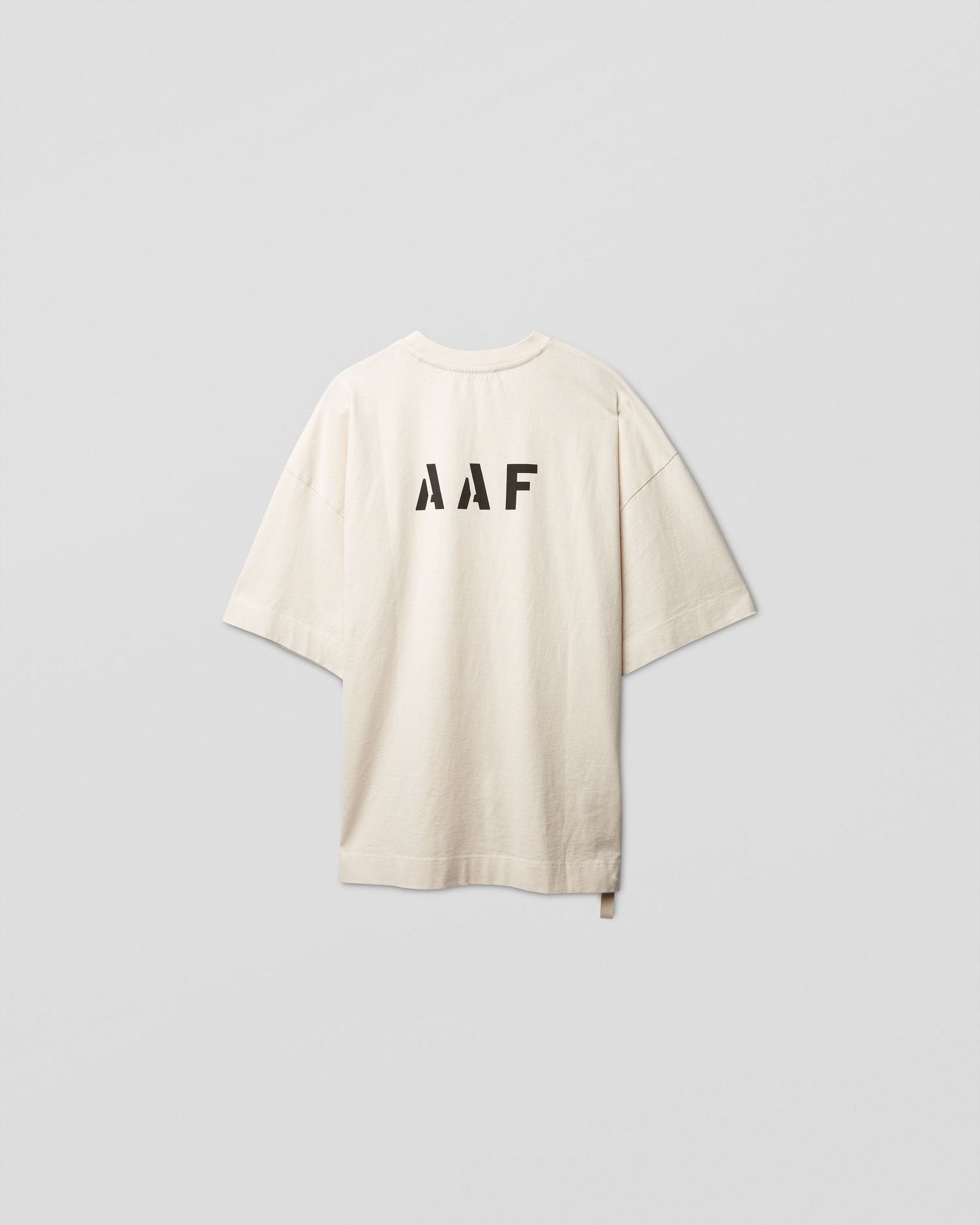 Oversized, boxy T-shirt with long sleeves cut from heavy cotton-jersey material. Very relaxed, off the shoulder cut. AAF logo in contrast color on back and APPLIED ART FORMS small logo on front. Garment dyed for a soft feel. Signature AAF tape detail on hem.