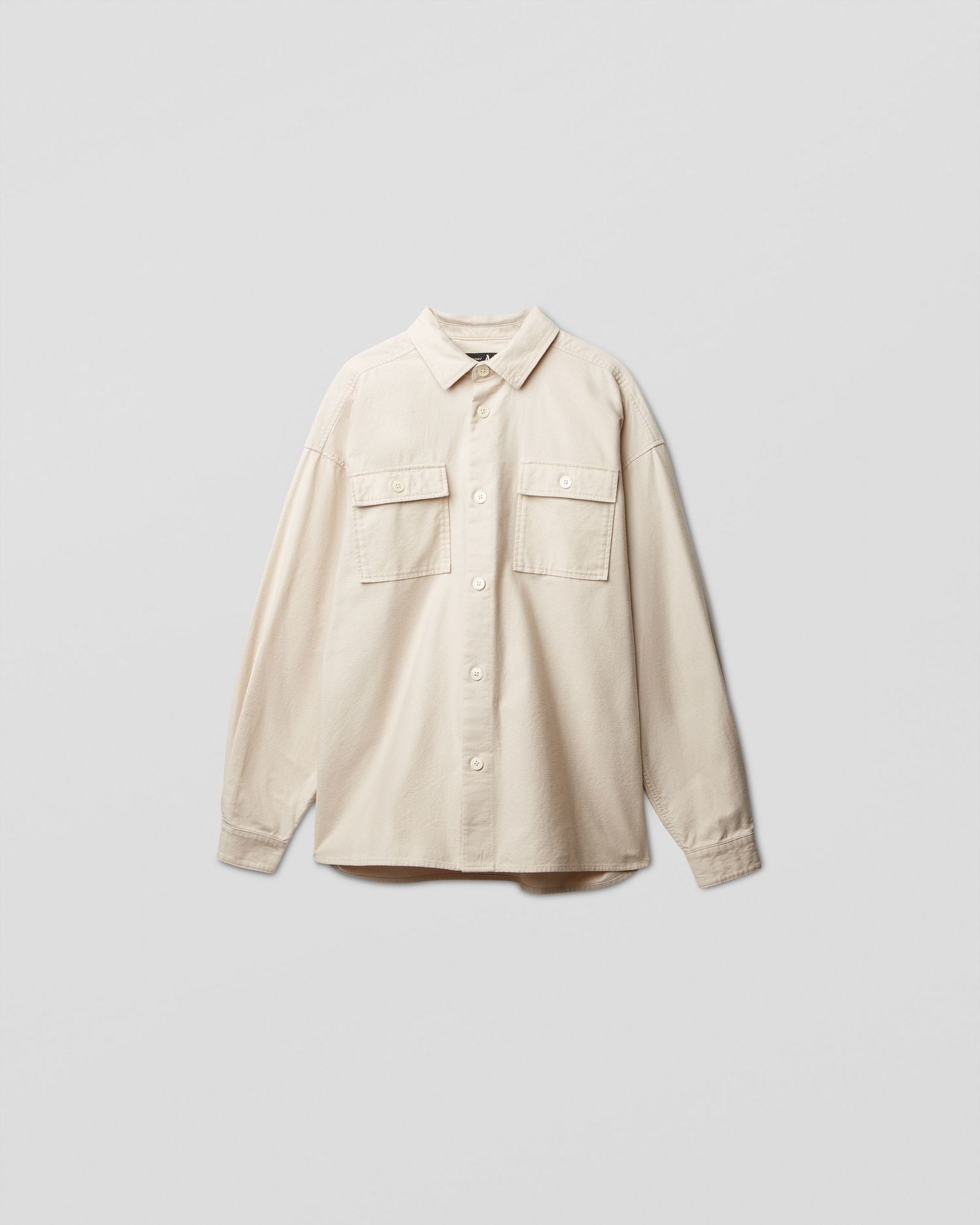 Oversized brushed ottoman cotton overshirt with chest pockets, large buttons, and adjustable cuffs.