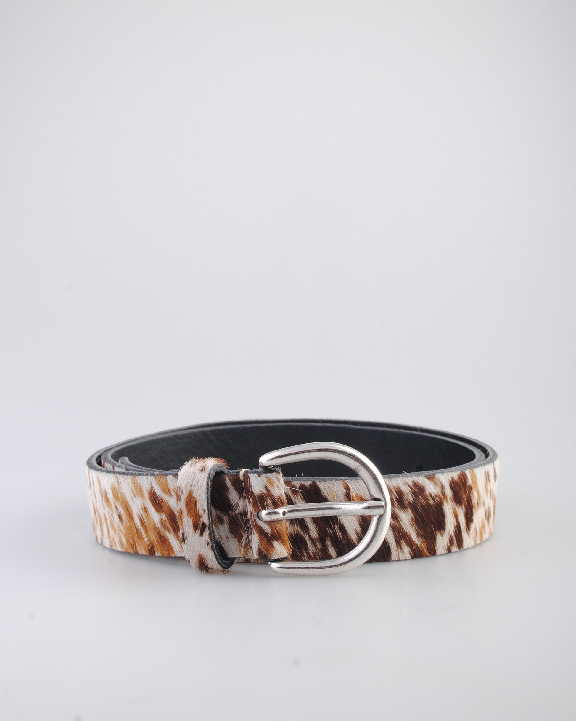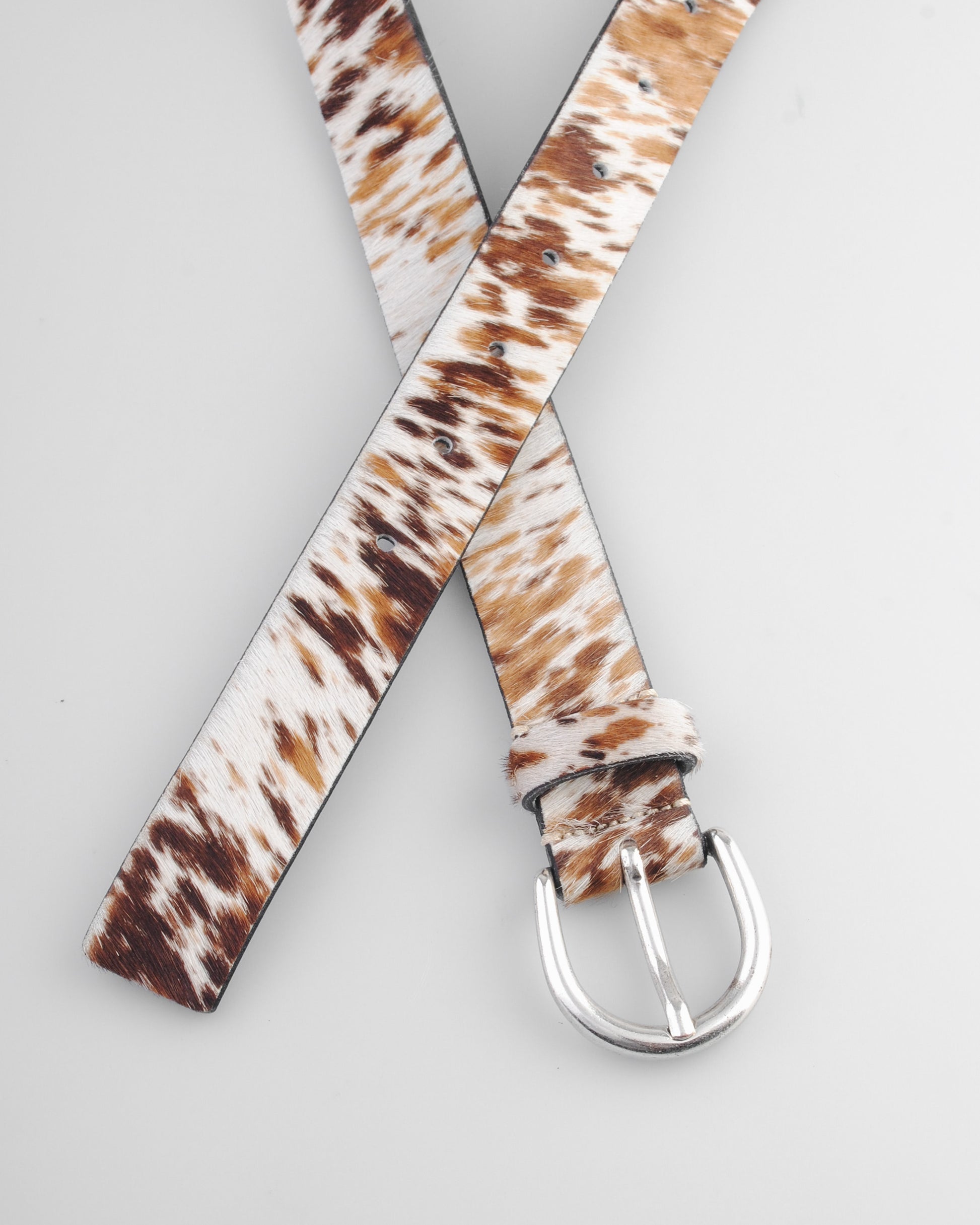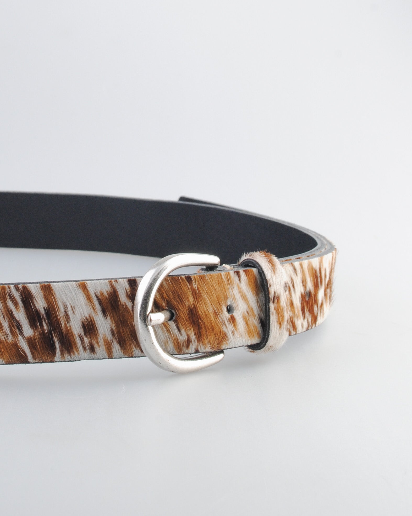 A beautiful leather belt constructed in two layers, a pony shark surface and a grain leather backside, offering a unique texture and durability.