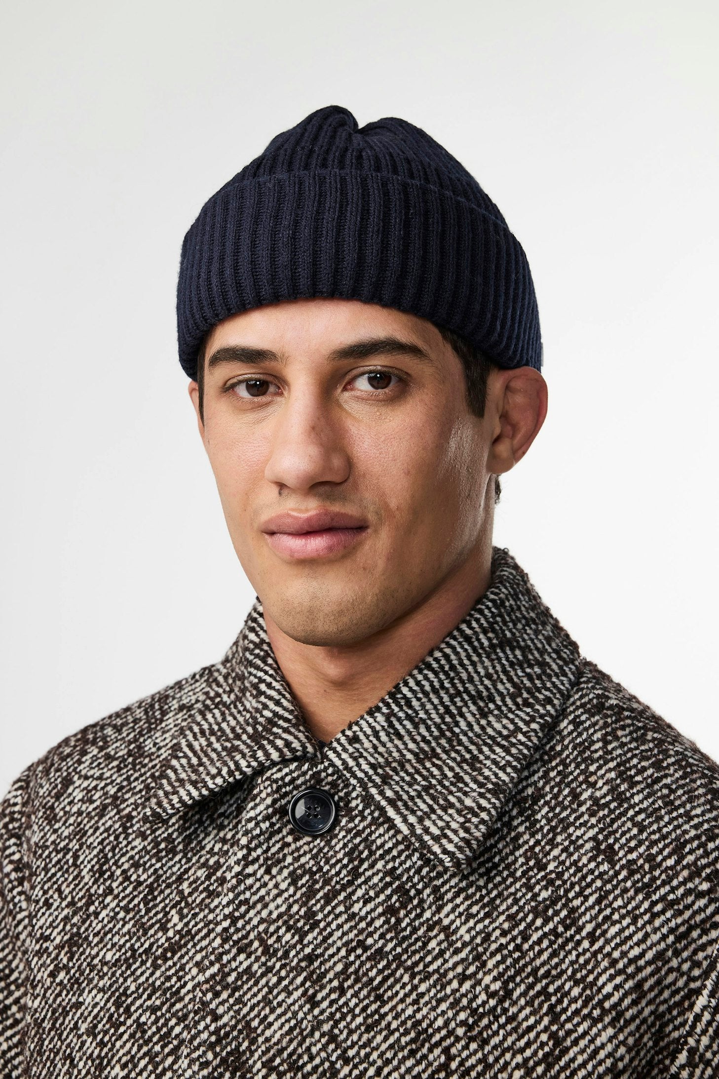 Seasonal rib knit beanie made in a very soft merino wool blend, complete with a double fold and a snug fit.
