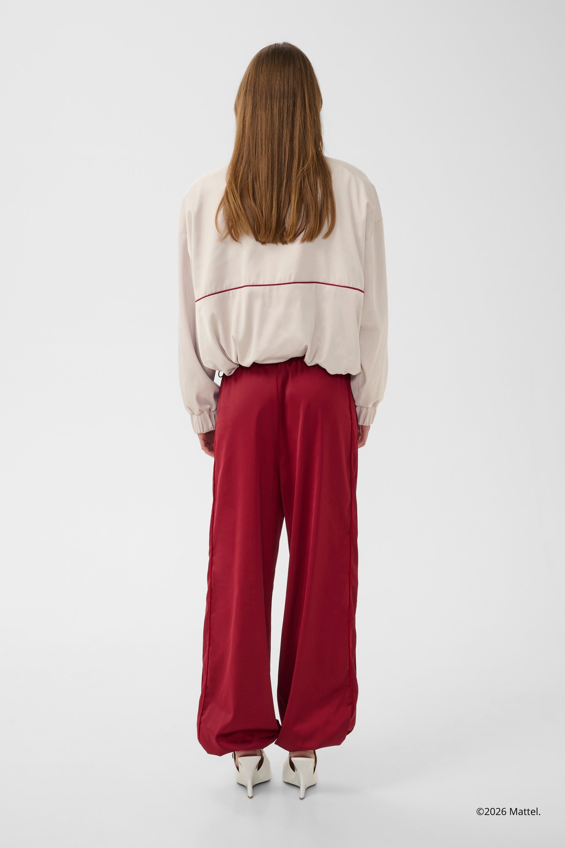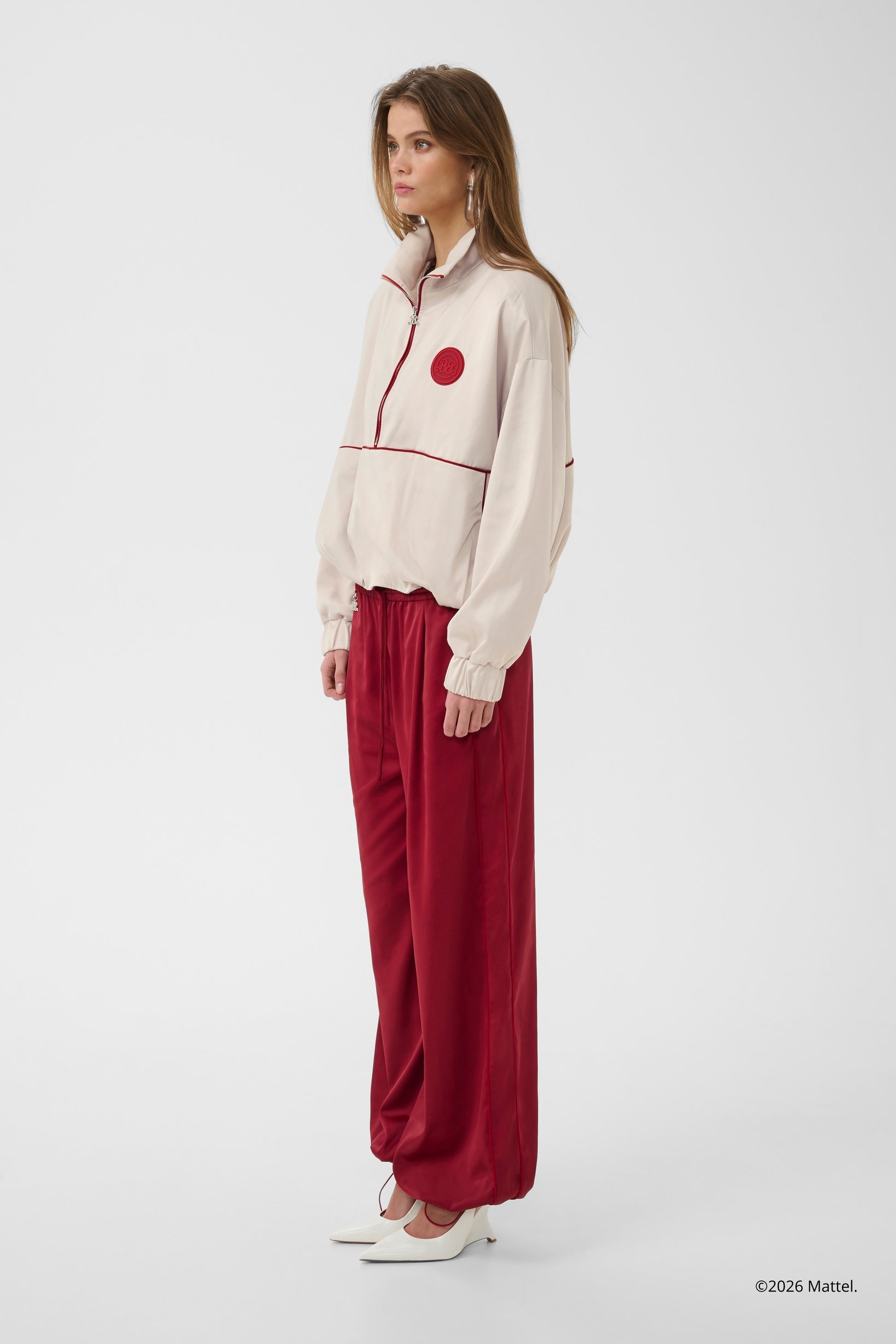Loose fit tracksuit jacket in heavy satin fabric with an elastic bottom and removable shoulder pads. The jacket features a Barbie badge logo on the chest and a Barbie charm on the zipper.