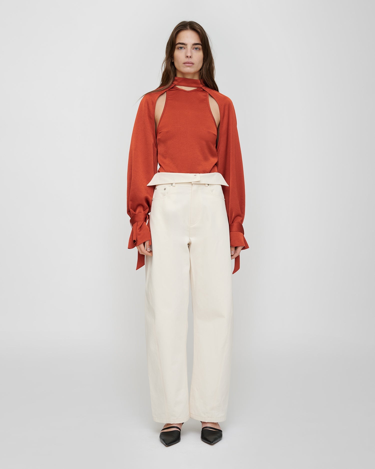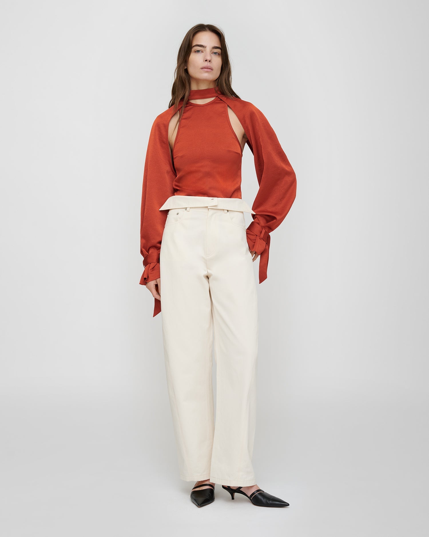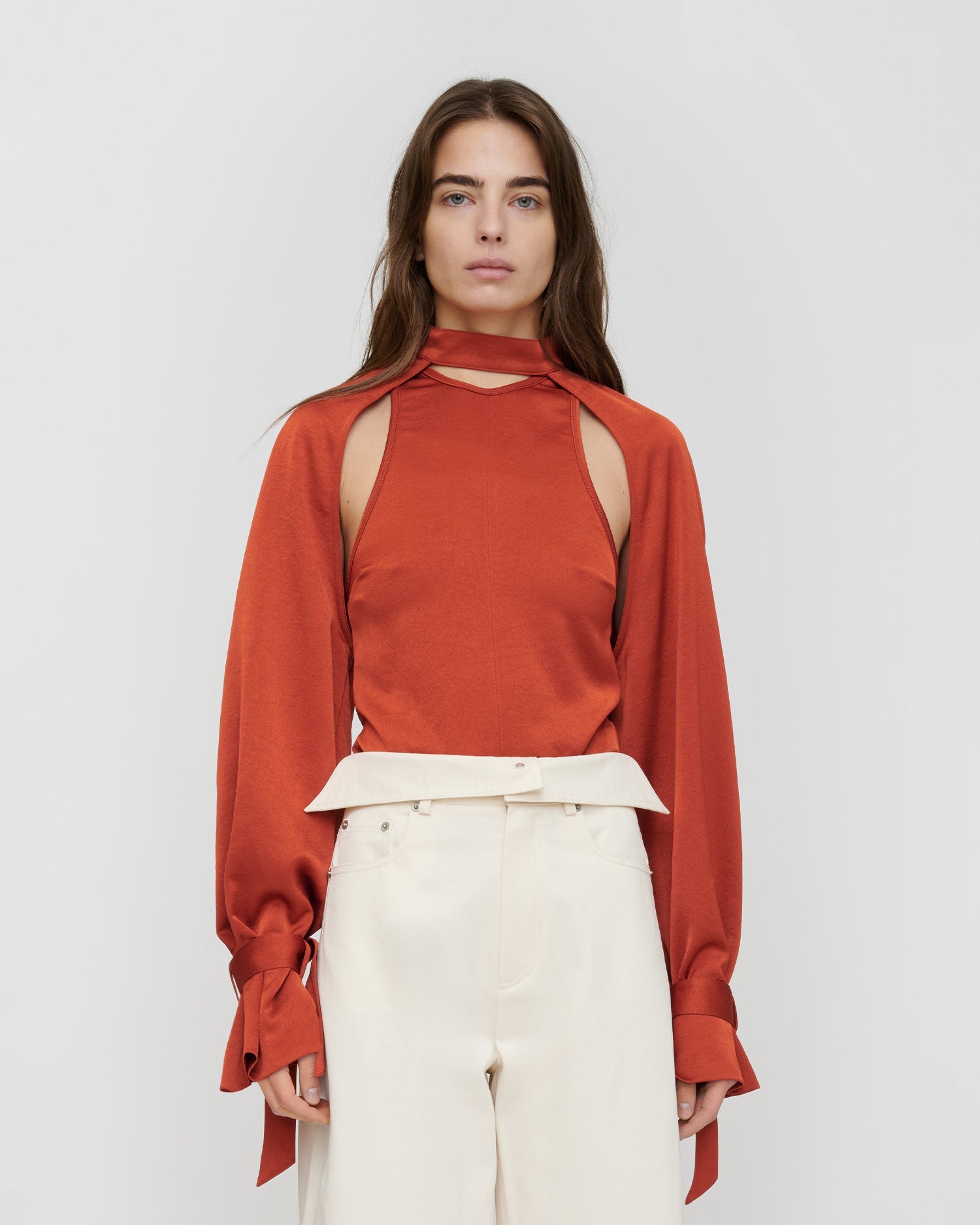 Cut to a clean silhouette, Made in Crisp satin, VETA Top in rouge delivers a considered balance of function and finesse. With close to the body, it flatters without restriction. It captures the collection’s play of light and texture.